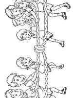 5 Touwtrekken kleurplaten.Touwtrekken is een sport en spel waarbij twee teams aan de uiteinden van een dik touw trekken om de tegenstander over een middenlijn te trekken. Het is een teamkrachtsport die zowel recreatief als competitief gespeeld kan worden, met specifieke regels voor het touw en de afstanden die getrokken moeten worden om een punt te scoren.